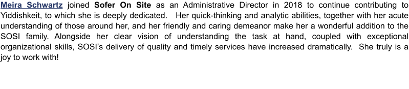 Meira Schwartz joined Sofer On Site as an Administrative Director in 2018 to continue contributing to Yiddishkeit, to which she is deeply dedicated.   Her quick-thinking and analytic abilities, together with her acute understanding of those around her, and her friendly and caring demeanor make her a wonderful addition to the SOSI family. Alongside her clear vision of understanding the task at hand, coupled with exceptional organizational skills, SOSI’s delivery of quality and timely services have increased dramatically.  She truly is a joy to work with!